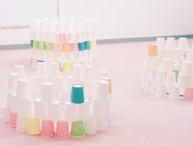 自分を乗せたロケットを作り、みんなで「せーの!ぴゅーん!」と飛ばして楽しんでいた子どもたち、最後は沢山の紙コップを使ってみんなで線路を作りその間を「ポッポー」と言いながら歩いたり、みんなで力を合わせてピラミッドを作ったりして楽しんでいました![]()