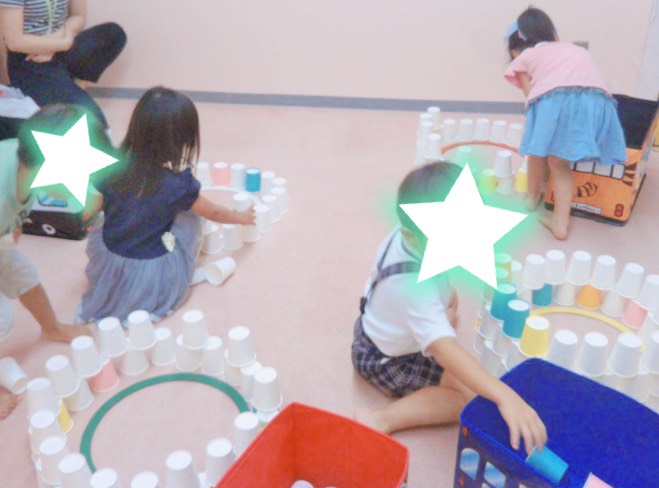 ゲームでは紙コップを誰が先に積み上げるかを競い合いました!出来上がるとお友達の応援をして楽しんでいました![]()