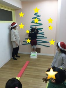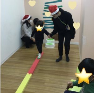 壁に貼られたいくつかのオーナメントの中から好きなものをとって、平均台を渡り、大きなクリスマスツリーに貼ることができました。