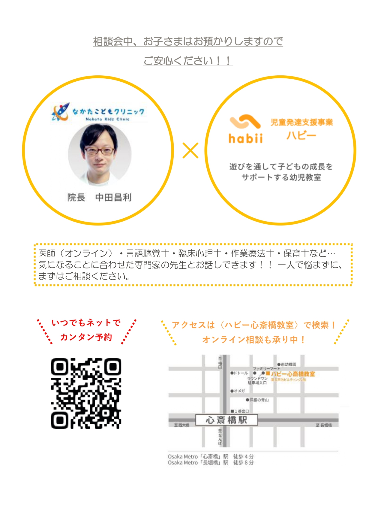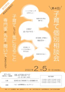 2022年2月5日(土)に「ハビー心斎橋教室」と「なかたこどもクリニック」と協同で【第4回 子育て個別相談会】を開催致します。