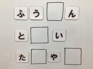 床に置いて並べながら考えたりホワイトボードに貼り付けながら言葉を完成させます。