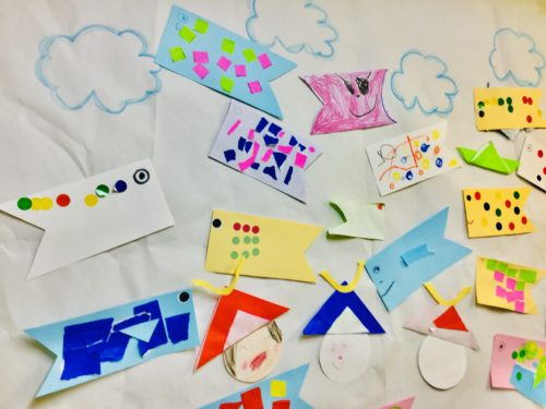 こいのぼり🎏の工作では、指先を意識して折り紙をちぎったり、丸の形に合わせてシールを貼りました。