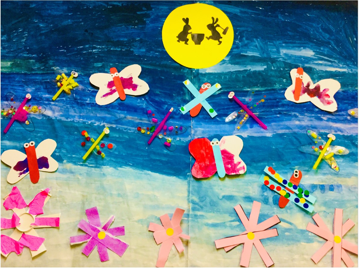 とんぼの羽にシールを貼ることで目と手を協応させる動きや、羽を斜めに貼る動きを取り入れました。
