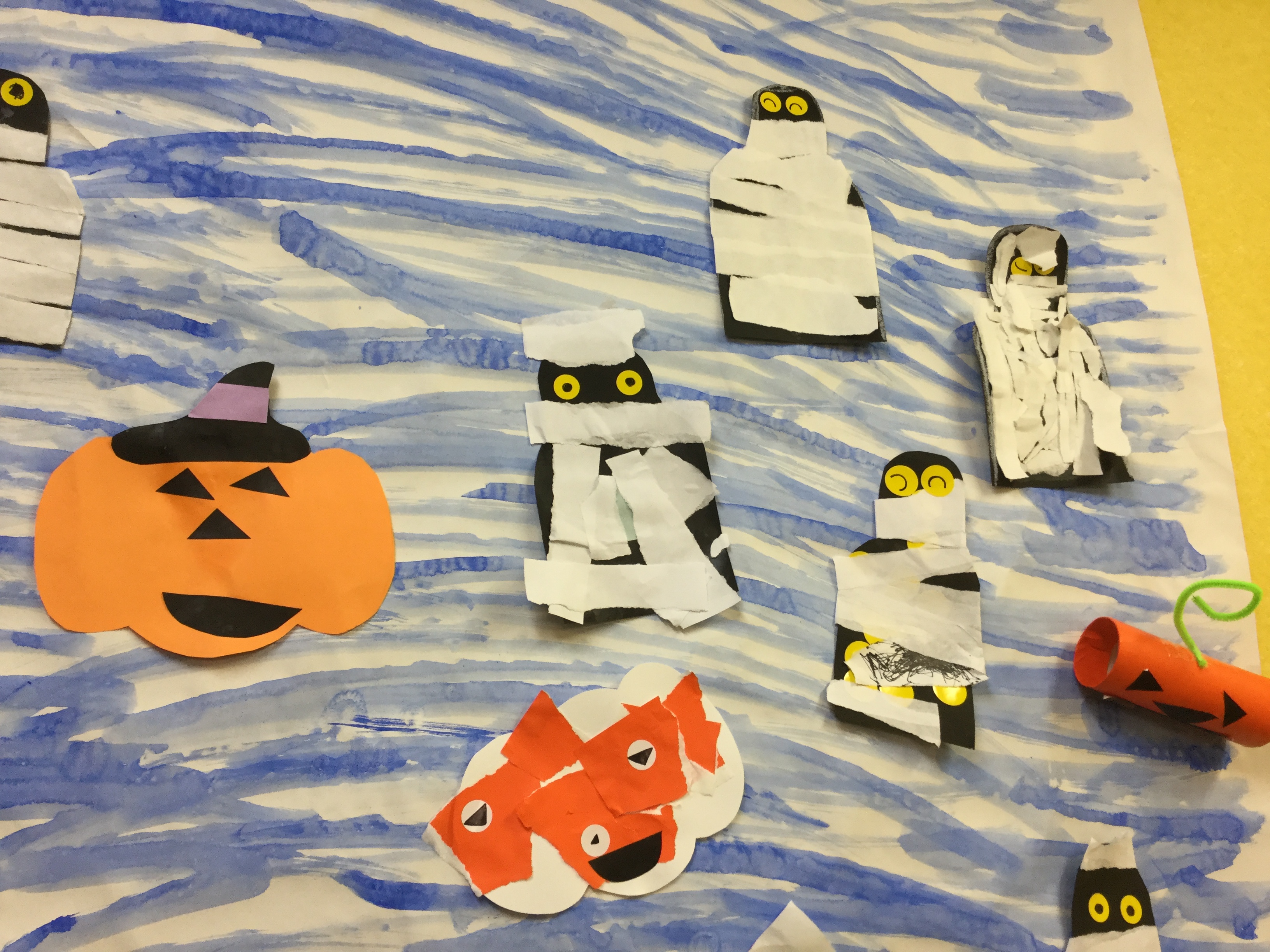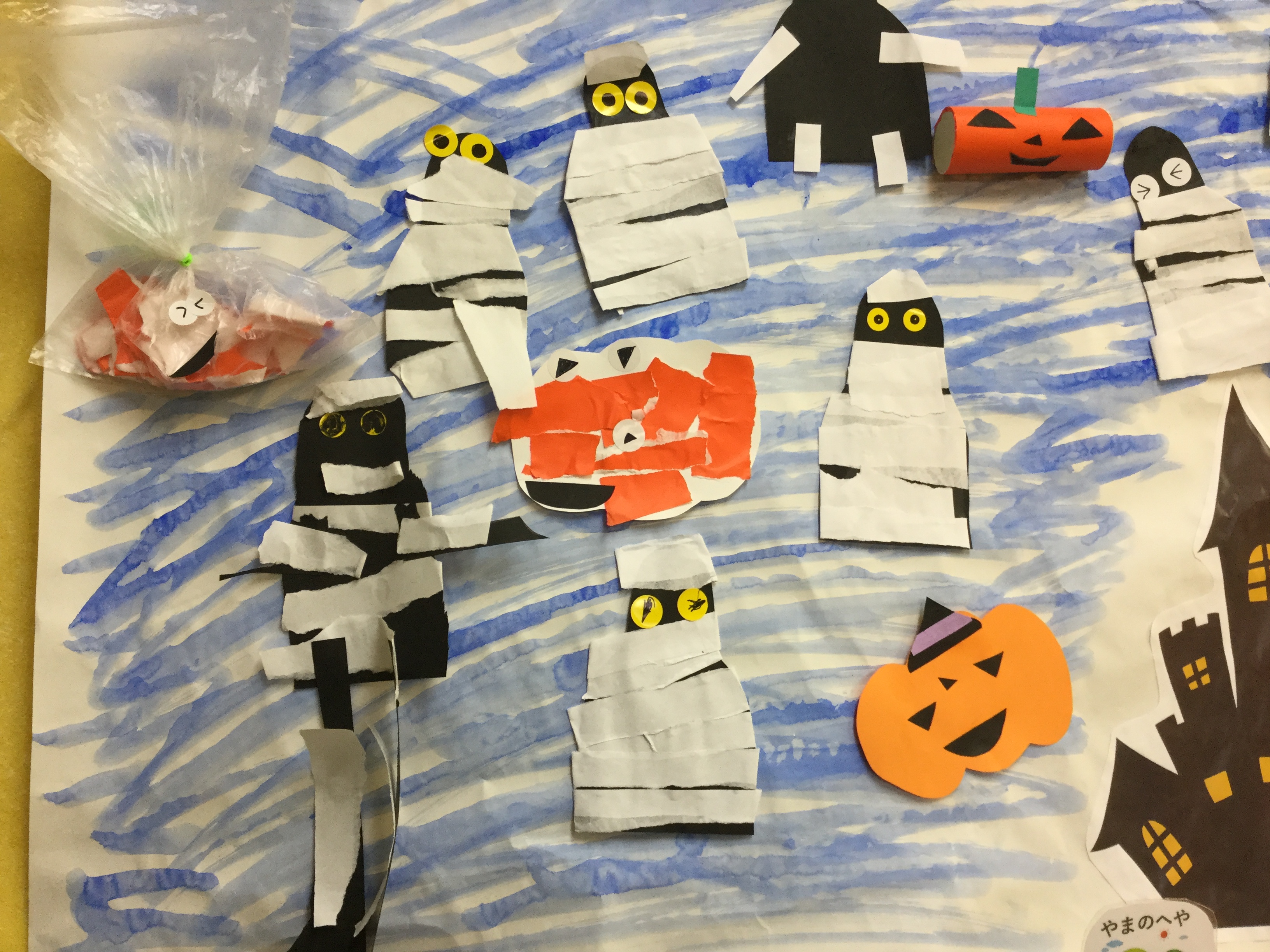 ミイラの包帯は、白い折紙を細長く縦に割いたり、はさみで直線切りを行って作りました。線に沿って切ることで、はさみの操作はもちろん、集中力も向上していきます。笑顔のミイラや足の長いミイラなど、お子様自身の工夫も見られ、個性的なミイラたちができました!