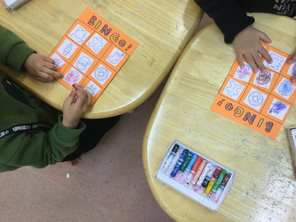 クリスマスイベントでは、ビンゴを行い、景品としてもらったお菓子の家(壁面制作)の教材を手に持ち、キラキラした笑顔で、楽しそうにお友達と一緒に家づくりを行っていました![]()