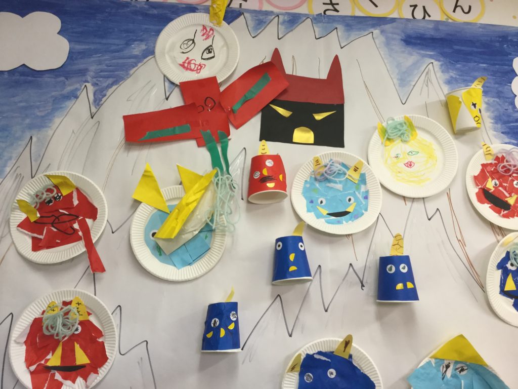 お子さんの状況によって顔を描くことやシールを貼ることを行いました。また、様々な色のオニがいますが、クレヨンで塗りつぶしたり、折紙を千切って色付けを行ったり、1枚の折紙を巻いたりして制作しました。