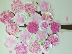 ちぎり絵の桜は、柔らかいお花紙を指でちぎって、糊を塗り広げた画用紙の