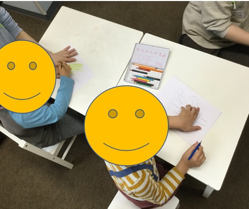 工作の時間では自分の手の輪郭を鉛筆で慎重になぞって手形を作り、