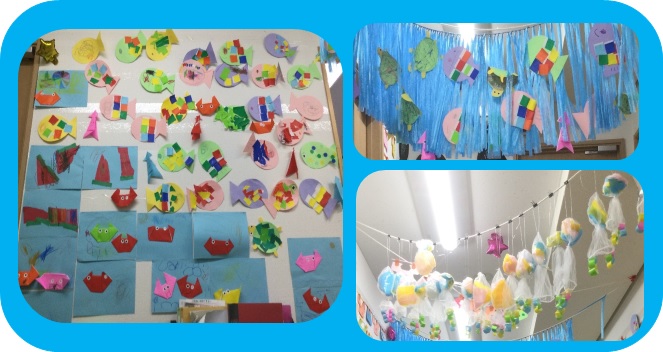 折り紙やシールのウロコがカラフルな魚、折り紙で作ったカニやイカ。