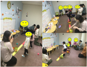 自分で投げて、的が倒れると「やったー」と両手を上げてジャンプをして喜ぶお友だちもいました(*’ω’*)