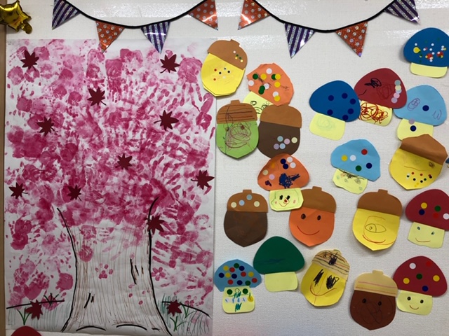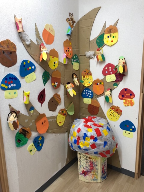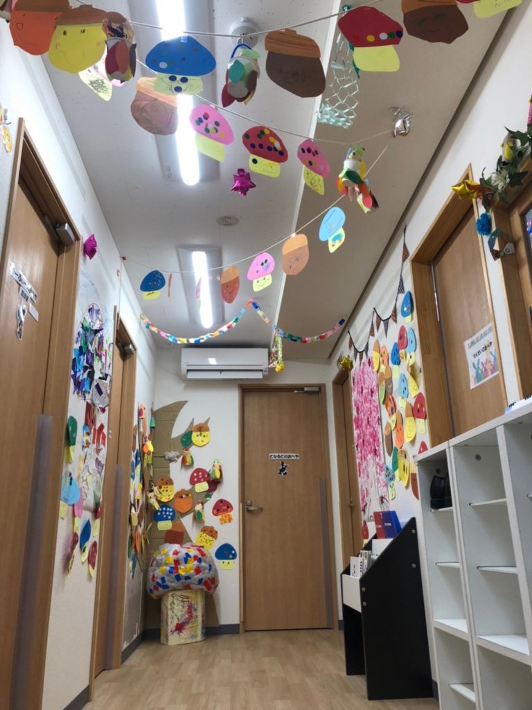 廊下の壁には様々な色のきのこ・どんぐり・くりがたくさん🌰