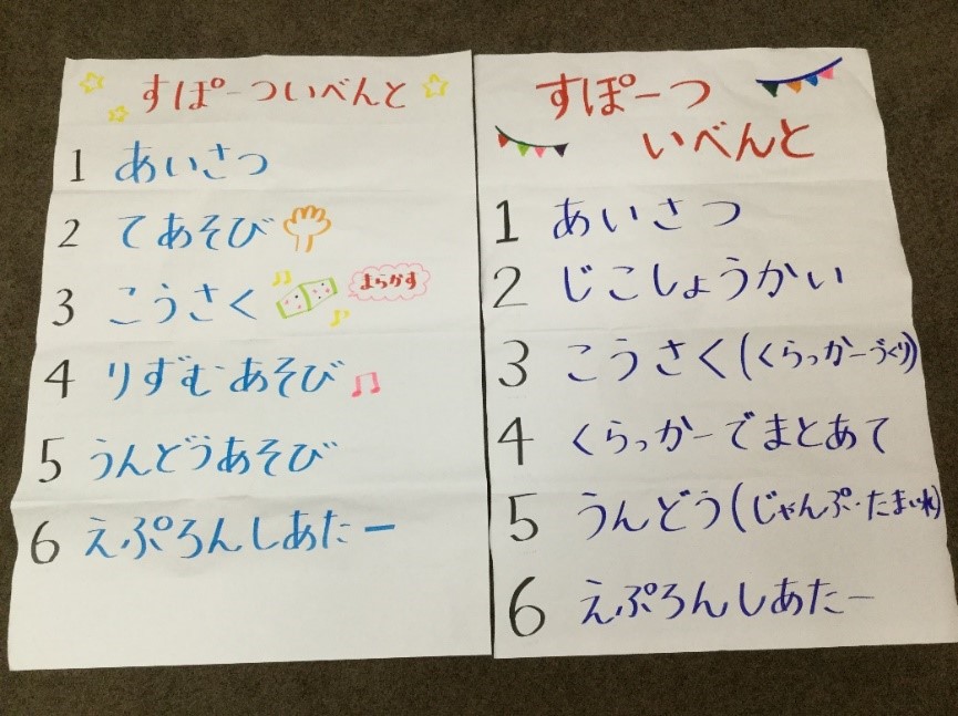 午前中の部ではプレ・年少さんが中心だったので、リズム遊びを取り入れた内容、午後の部は年長さんの参加もあり、ルールや順番のある運動遊びを取り入れた内容となっております!