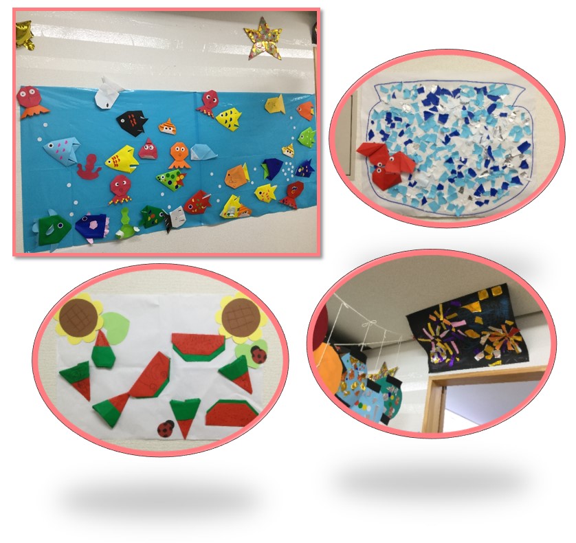 こちらは折り紙で作ったお魚やたこを泳がせた海やスイカ🍉、金魚🐟や花火も🎆