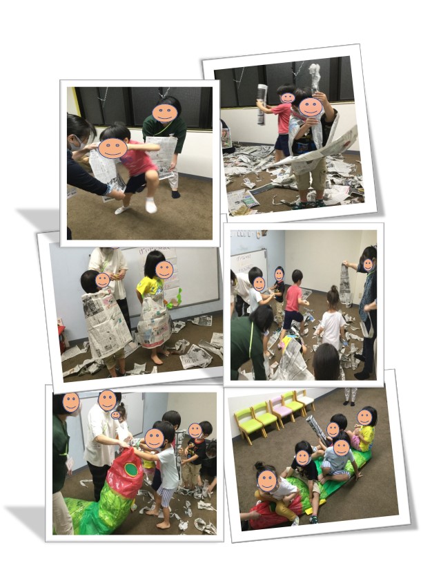 落ち葉のような新聞紙の中に隠れたり、新聞紙で傘を作ってトトロのようにお散歩をしたり、子どもたちの発想は無限大✨