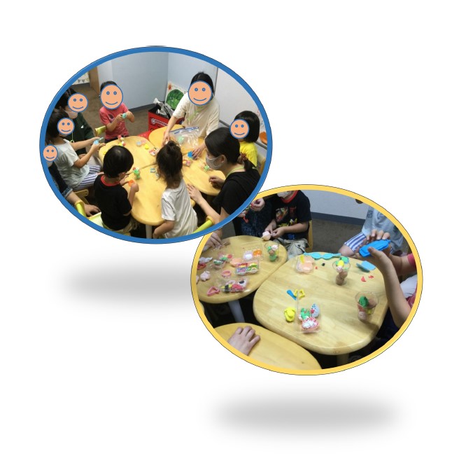質感や色彩を楽しみながら、ちぎる・にぎる・まるめる・のばす、と手先を使って発想豊かに遊んだ子どもたち!いつもは粘土が苦手だったお子様も、楽しい雰囲気の中で粘土を触ることができ、みんなで楽しむことができました😊おすし、クッキー、アイス・・・できた作品をお友だちに自慢げに見せてくれる笑顔は最高でした✨