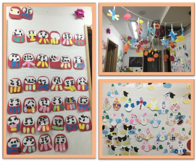 1月はだるまや今年の干支にちなんだ牛、冬の果物、雪だるまを作りました🍎🍊